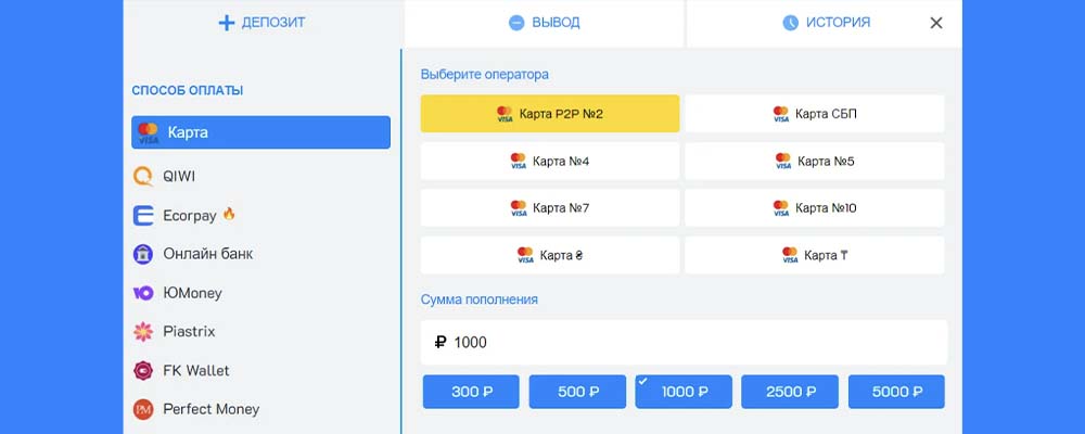 В онлайн казино Баунти минимально пополнить игровой баланс можно на 100 RUB при помощи удобной системы оплаты.