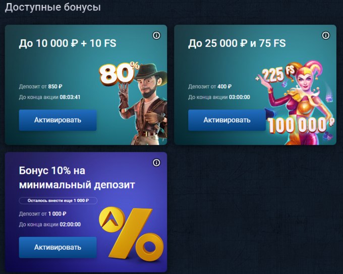 | Поощрения | % к первому депозиту, кэшбэк, фриспины |
