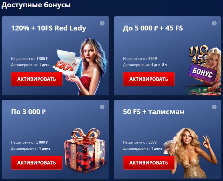 Весь список доступных в казино Роял Раша промо-предложений отображается в разделе «Бонусы», который предусмотрен главным меню вверху страницы. Здесь же можно узнать, какие постоянные акции проводит оператор.